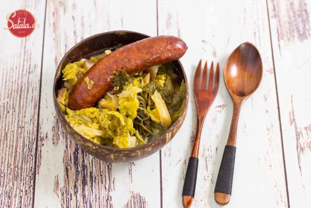 Winterlicher Wirsingtopf mit geräucherten Würsten