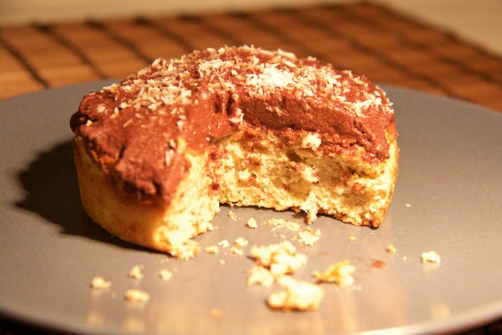 Die Masse auf den Küchlein bzw. Doughnuts verteilen, glatt streichen und mit Kokosraspeln verzieren.
