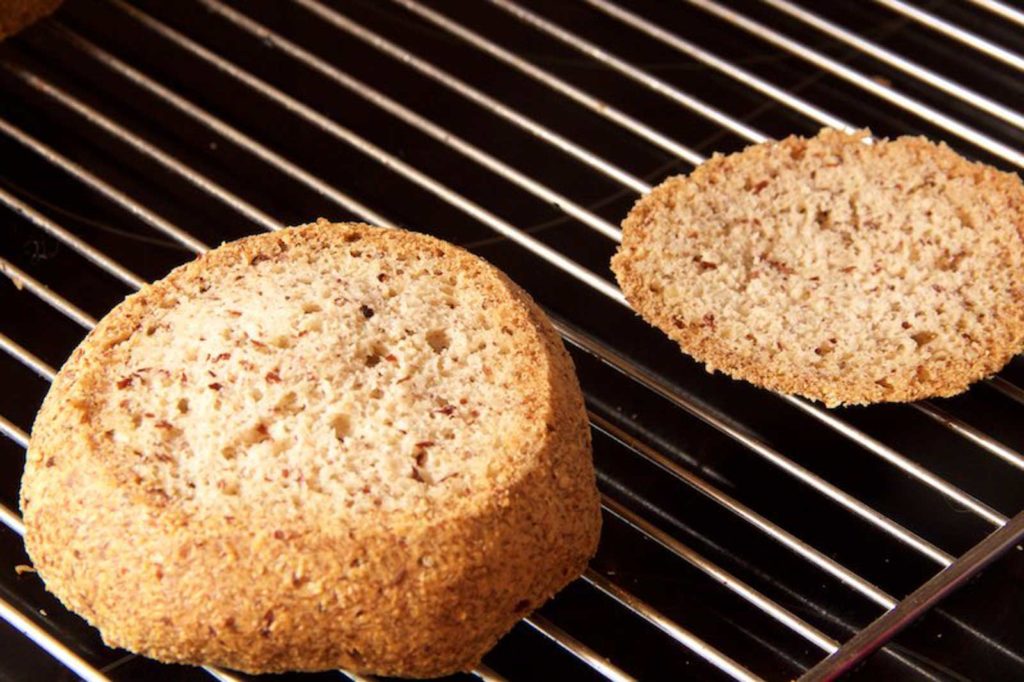 Keto-Semmeln köpfen, etwa das obere Drittel vorsichtig abschneiden.