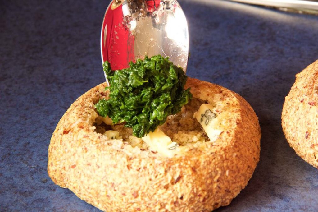 Ein paar Würfelchen Blauschimmelkäse reinlegen.