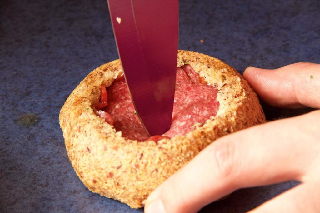 Mit zwei Scheiben Salami abdecken. Die Salami gut unter den Rand stopfen.