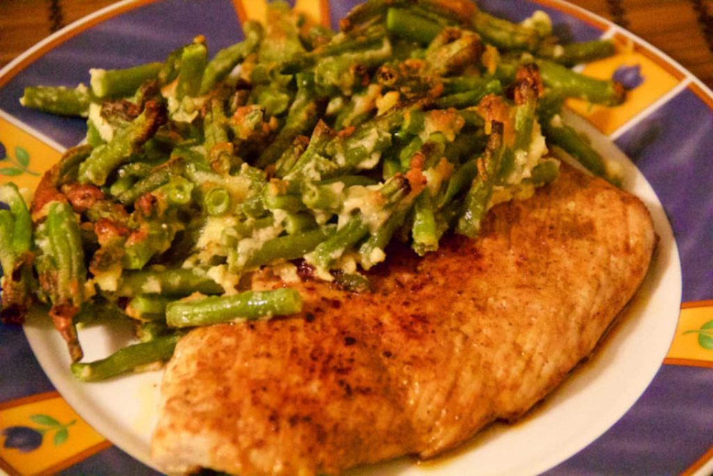 grüne Bohnen in eine leicht gefettete Auflaufform geben